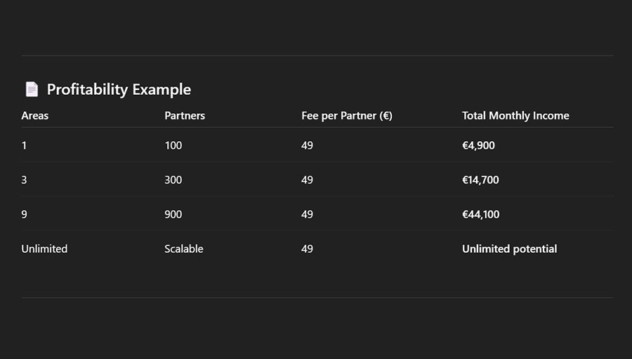 Imagine a model where one exclusive agent per area gets the full marketing power of 100 partners. Each contributes 49€/month, creating 4,900€ in joint marketing funds. With three areas, that’s 14,700€, and the model scales without limits.